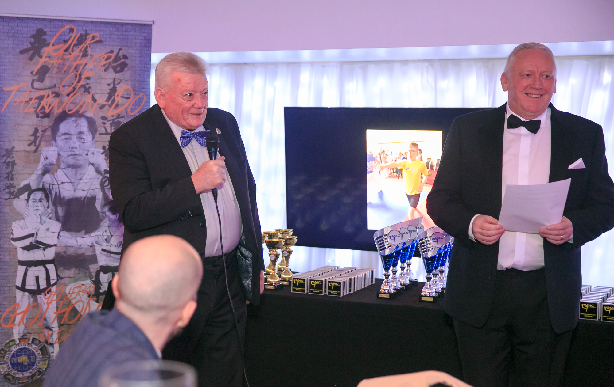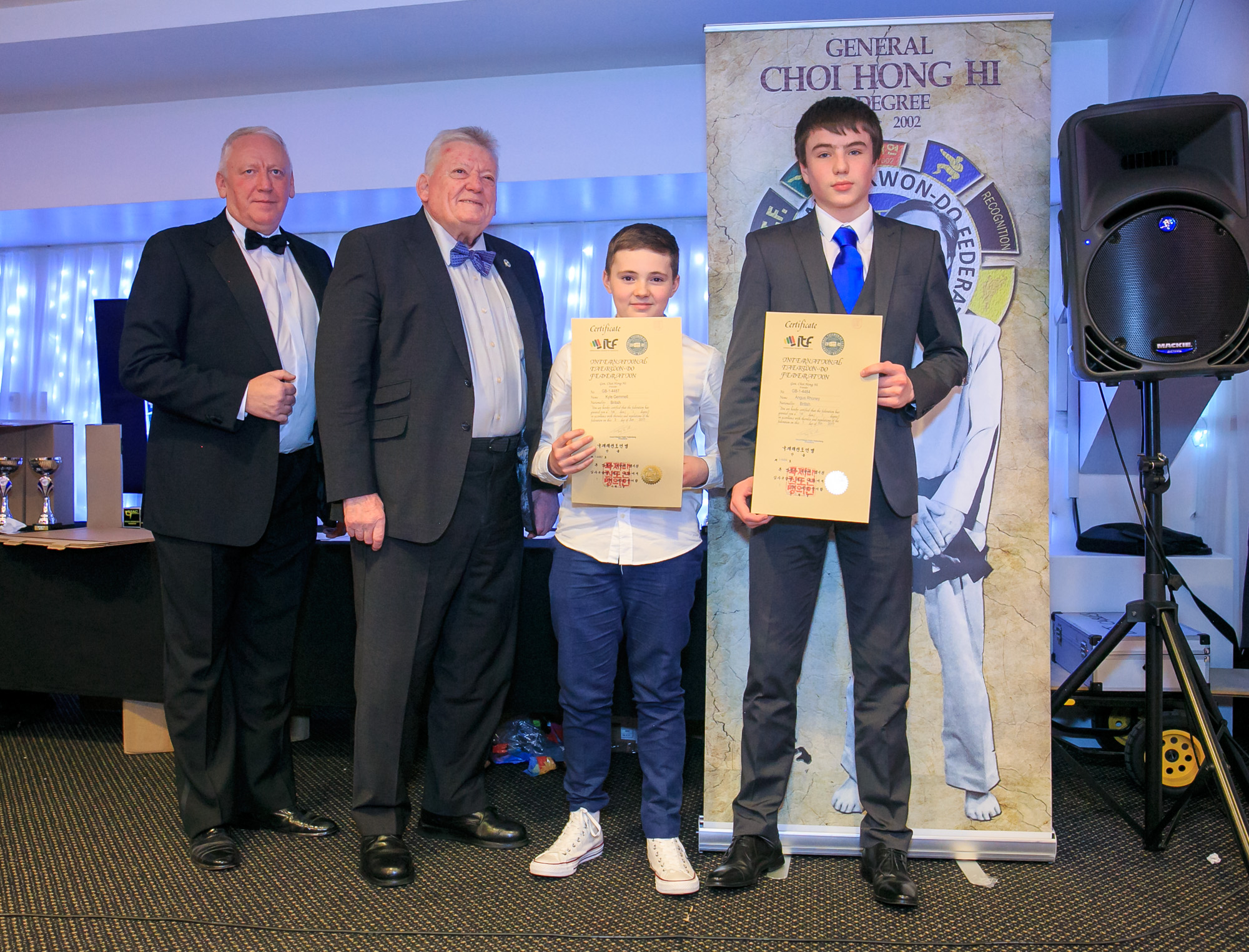 The final presentation of the evening saw certificate presentations for those who passed their black belt promotions this past year. Presentations were made by Grand Master MacCallum to Mr. Angus Rhoney (1st Degree) and Mr. Kyle Gemmell (1st Degree). Also to Mrs. Gillian McIlvaney (5th Degree).