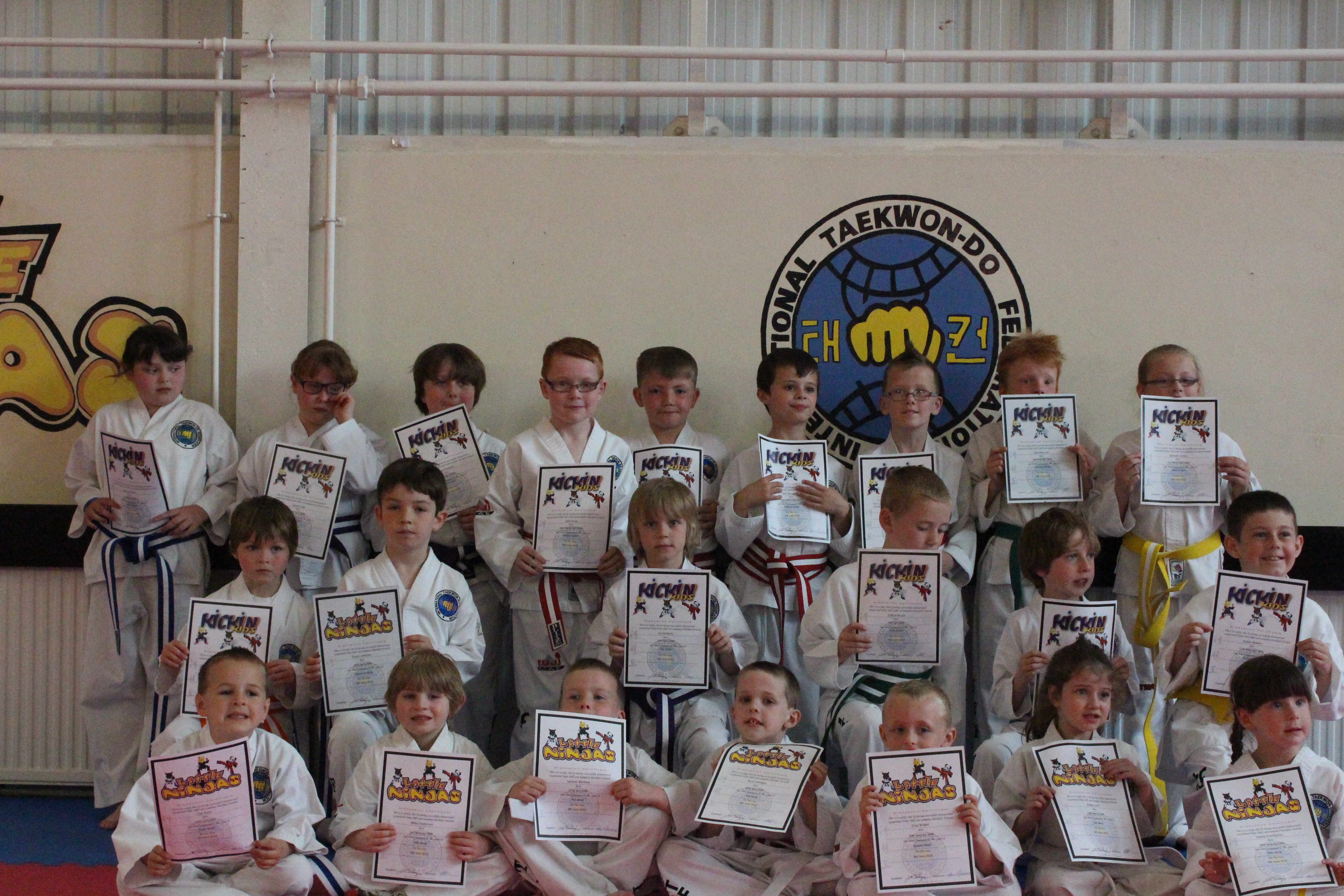 Next up it was the turn of our Little Ninja’s & Kickin Kids withGrand Master MacCallum joining Mr McIlvaney as guest examiner. ย The students put on a good show on the floor to succeed in receiving their new belts as follows;