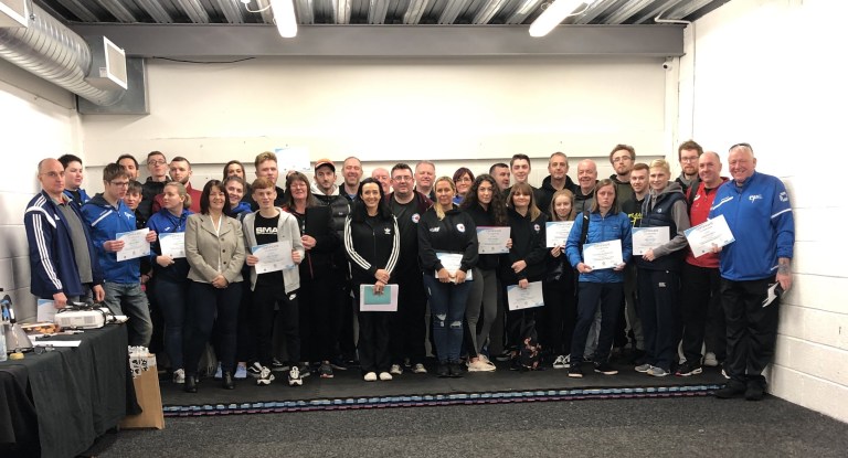 Pictured alongside the group are GMAC instructors who took part; Mr. John McIlvaney, Mrs. Gillian McIlvaney, Mr. Kieran Cain and Mr. George Russell.