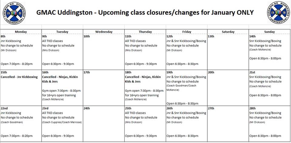 Our Uddingston class will be running a few temporary timetable throughout January while we take our annual leave, most classes will however remain unaffected by this.